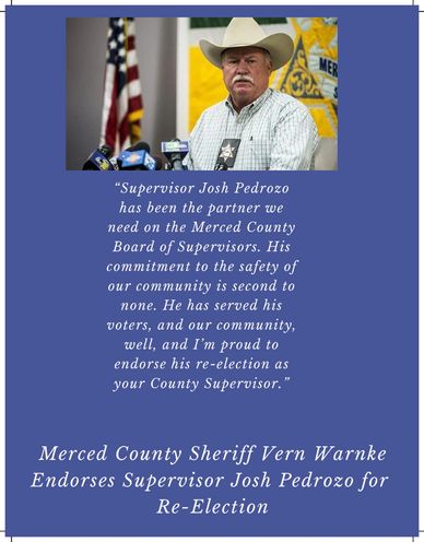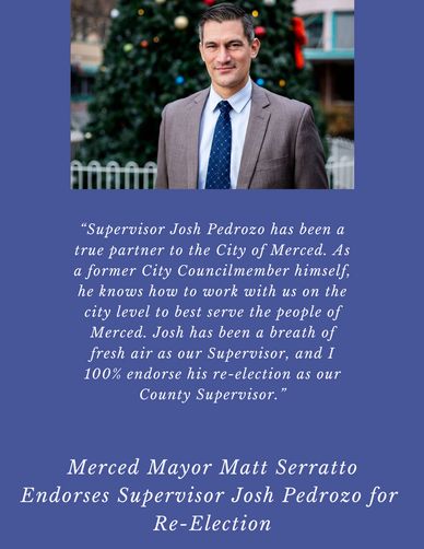 “It has been a pleasure serving as your County Supervisor. Together we have achieved so much. From helping secure 2.5 million to renovate the jewel of our Downtown, the Courthouse museum, to procuring money to develop the former Castle Air Force Base into an inland port, and in turn, a massive job creator for our County, to helping secure 2.5 million for our County’s Probation Department to help set youth who would be incarcerated, onto the right path in life, I have worked hard to ensure that each and every person in my District feels that their voice is heard on the County Board of Supervisors. But there is so much more work to do, from the continued expansion of the Campus Parkway, to ensuring that our County continues to battle homelessness, unemployment, and a lack of medical access. My job here is not yet finished, that’s why I’m asking for your vote for re-election to the County Board of Supervisors in the March 2024 Primary. It would be an honor to once again secure your trust and your support as your County Supervisor”